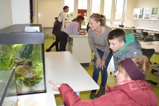 Besonders beliebt bei den jungen Besucherinnen und Besuchern waren die zahlreichen Mitmachangebote in den Fachräumen. In den naturwissenschaftlichen Räumen für Biologie und Chemie durften interessierte Kinder erste Experimente selbst ausprobieren. Das große Aquarium faszinierte viele Gäste und ein Blick durch das Mikroskop eröffnete eine spannende Welt, die es zu entdecken galt.